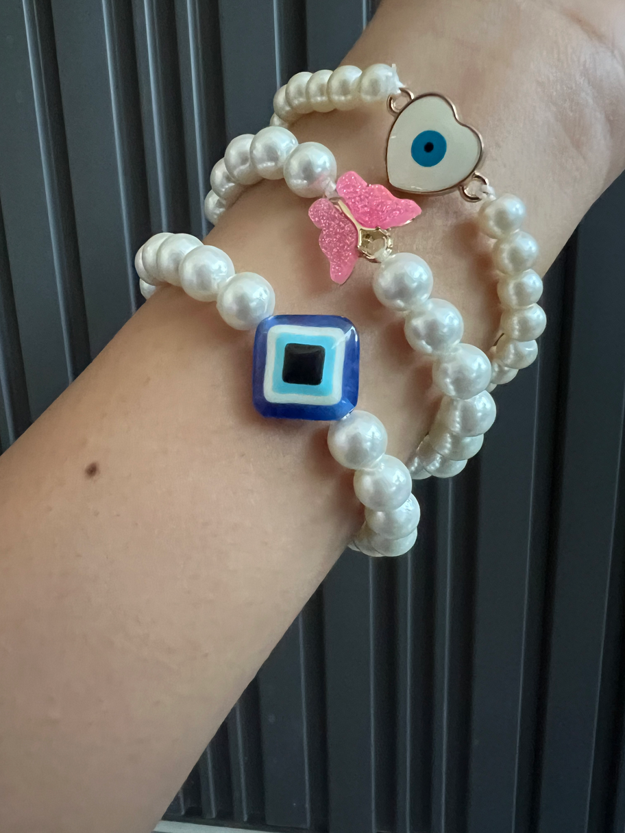Add a touch of timeless charm to your accessory collection with this beautifully handcrafted bracelet. Featuring a string of lustrous faux pearls, this piece is elevated by a bold and modern geometric accent bead in deep blue and white tones, creating a perfect harmony of classic and contemporary styles.