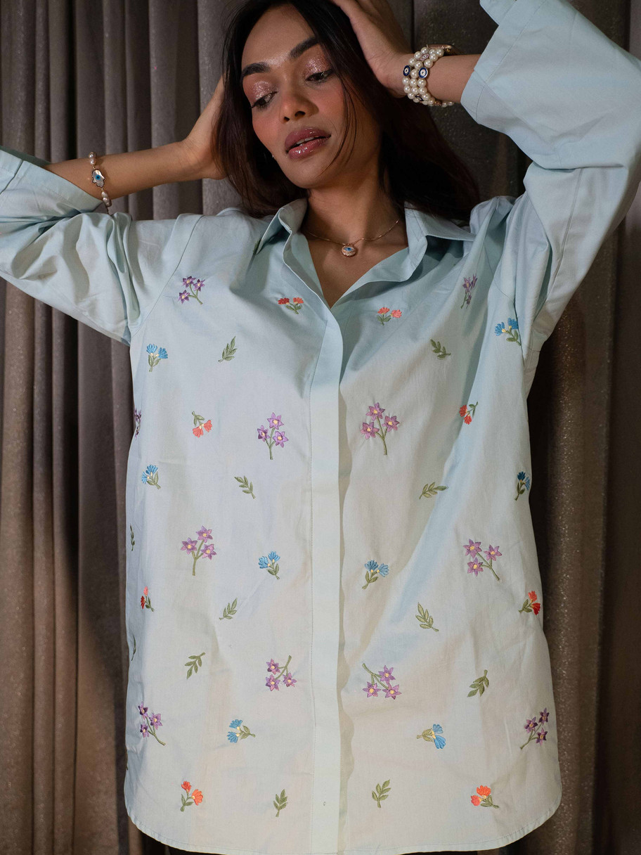 Add a breath of fresh air to your wardrobe with our Pastel Bloom Embroidered Shirt . Crafted from soft, breathable cotton in a serene mint green shade, this shirt is adorned with delicate multicolored floral embroidery for a whimsical, nature-inspired charm.