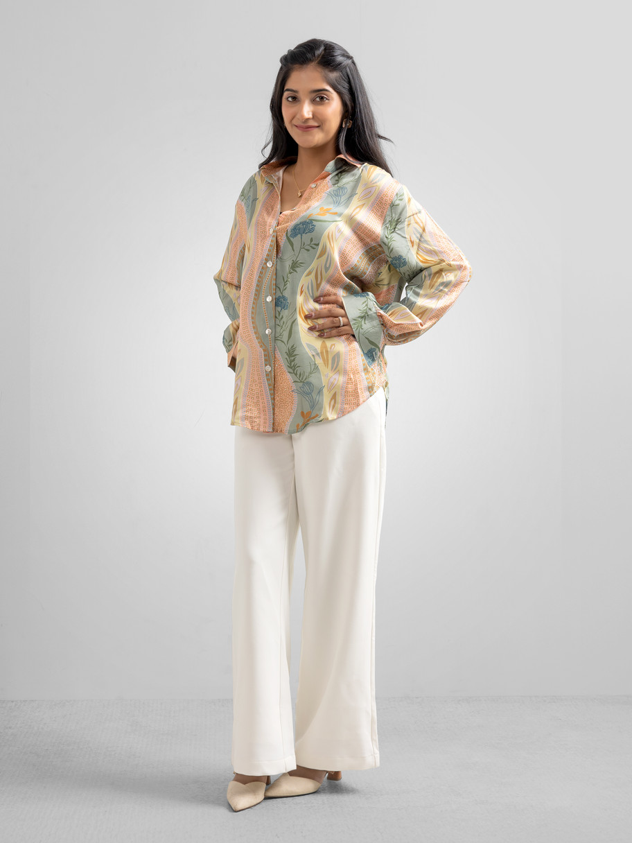 :Elevate your everyday wardrobe with this effortlessly chic Printed Button-Down Shirt, a perfect blend of comfort and contemporary design. Crafted from lightweight, breathable fabric, this shirt is adorned with an elegant mix of pastel tones and nature-inspired motifs, making it a standout piece for any season.