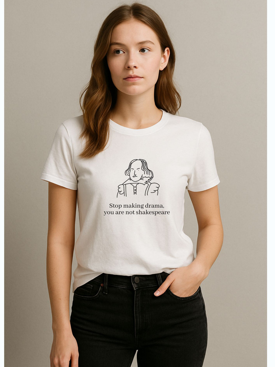 Add a literary twist to your wardrobe with our hilarious and clever “Stop making drama, you are not Shakespeare” graphic tee. Featuring a minimalist line-drawing of the Bard himself, this shirt serves up sarcasm with a side of smarts. Made from ultra-soft cotton, it’s perfect for book lovers, theatre fans, and anyone who appreciates a good mic-drop moment.